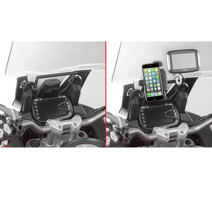 It is possible to mount GIVI device holders S952B, S953B, S954B etc directly onto the FB_ _ _ or alternatively, the elegant S902A support, machined from solid aluminium which can be used to mount the various device holders S952B, S953B, S954B etc without using the nylon mounting system, providing the bike with a highly technical look. Also compatible with the universal smartphone holder pliers S920M