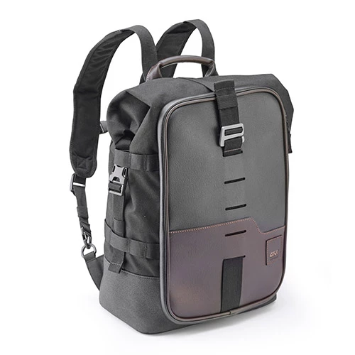 Rucksack which can also be used as a saddle bag, 18 ltr. With its classic design, it is particularly suitable for retro-style bikes or cafΓ© racers. Materials: High-tenacity 1200D W/R coarse polyester. Dark brown and black vegan leather (PU). Features: Retractable shoulder straps to allow use as a saddle bag. 4 straps for fastening to saddle. Waterproof roll-top closure system. Removable waterproof inner bag with IP X5 impermeability (resistant to heavy rain and extreme conditions). Dimensions: 410 cm x 180 cm x 270 cm. Capacity: 18 litres.