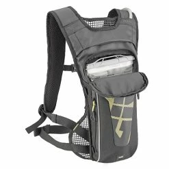 Thanks to the perfect adherence to the rider’s body and the 2-litre HydraPak Elite bag, it is particularly suitable for off-road use. Materials (manufactured within REACH recommendations): High-tenacity 1200D W/R polyester. Hypalon inserts. High UV-resistant external material. As standard: Main pocket with HydraPak Givi Elite 2L water bag included; Locking system to keep drinking tube on shoulder strap; Secondary pocket; Stabilised handle; Breathable back panel; Chest strap with whistle; Quick-release shoulder straps make it easy to remove the rucksack from the shoulders; Reflective inserts. Dimensions: 420 cm x 60 cm x 200 cm. Capacity: 3 litri.