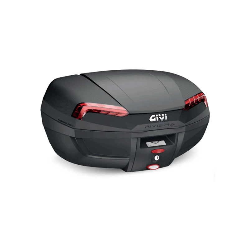 Givi E46N motorcycle top case with Monolock Riviera series hook with 46-liter volume with red reflectors.