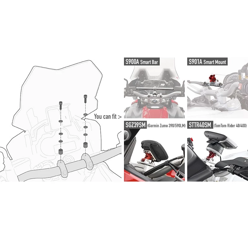 Specific kit to mount the S900A Smart Bar, S901A Smart Mount, or specific supports SGZ39SM (for Garmin Zumo 390LM and 590LM) and STTR40SM (for Tom Tom Rider 40 and 400).