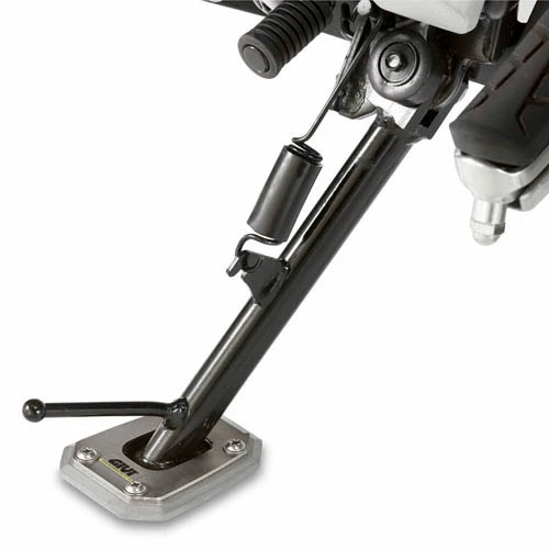 Specific support in aluminum and stainless steel to widen the surface support area of the original side stand.