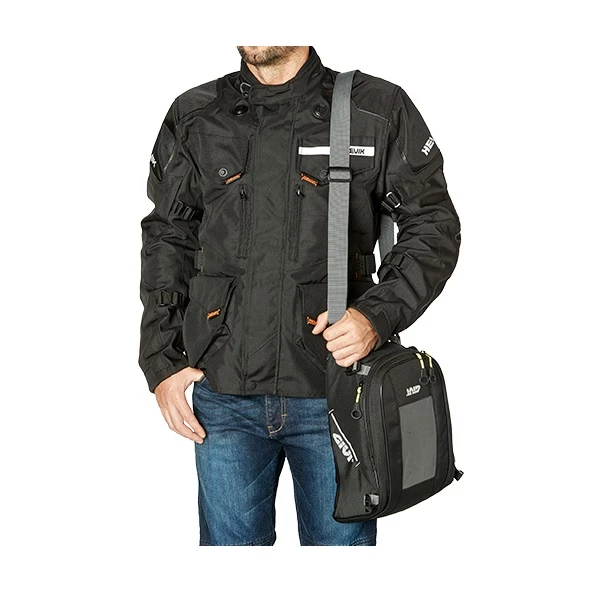 Using the dedicated harness, the bag attaches to the lid of the integrated storage compartment.